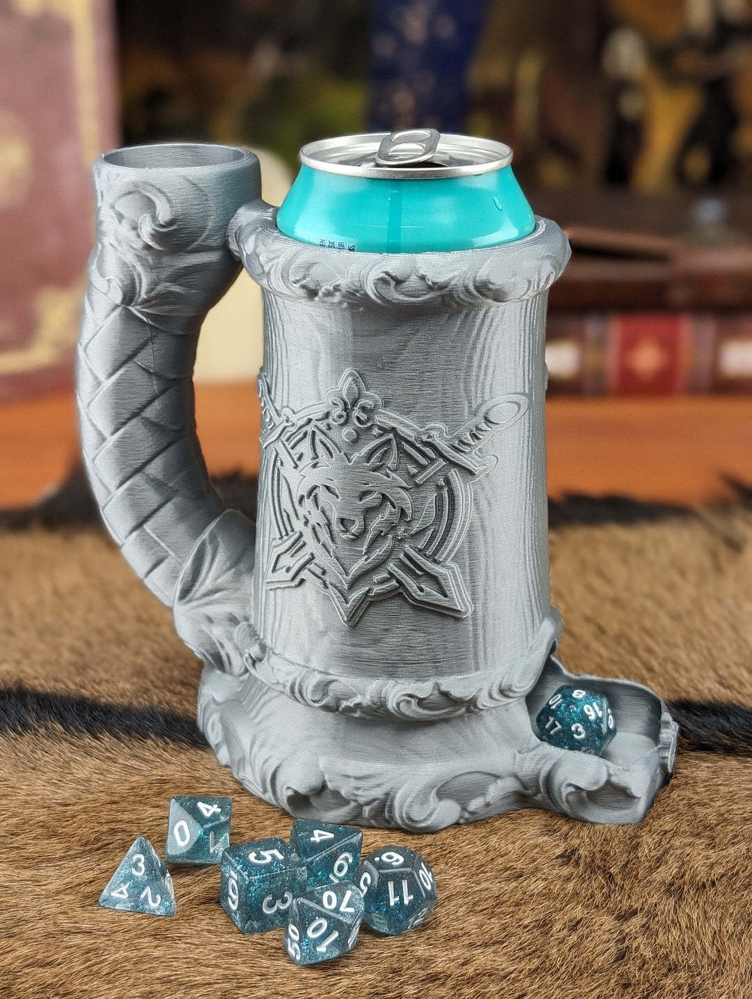 Be the envy of the table at your next D&D night with this can coozie / dice tower combo piece!